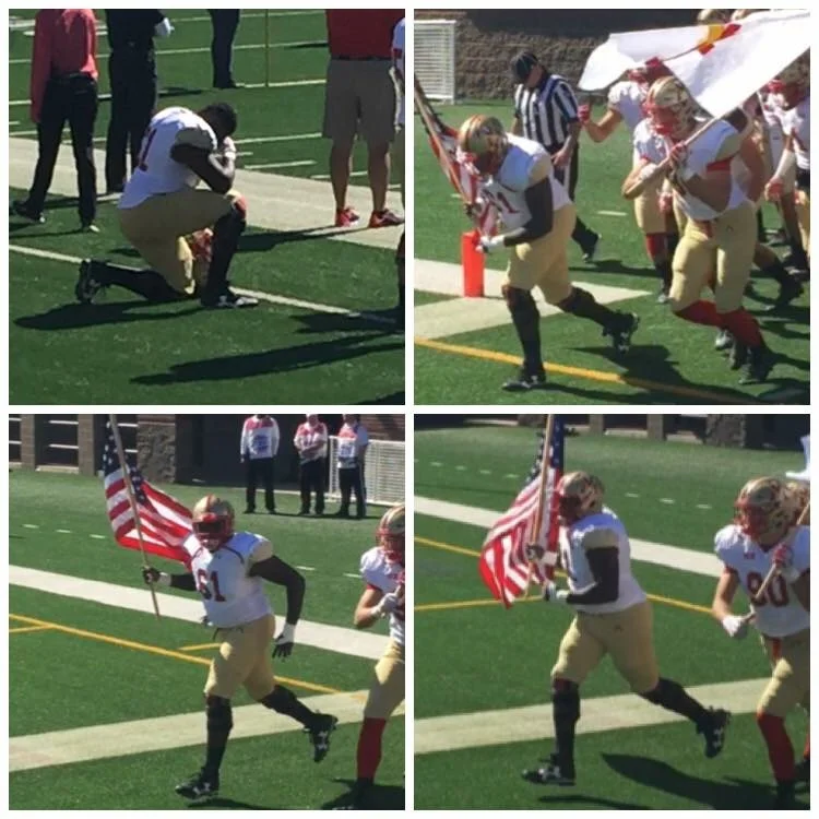 Saturday, my baby ran out with the flag...honestly, I was most excited to see ---that even by himself, he stopped a moment to pray. Someone asked me what was my position on "all this flag and anthem controversy"...and I "must've been proud that my son chose to not protest". My response went sort of like this: "Sir, with all due respect...this was an act of pride, but mostly obedience. He did what he was asked to do...and leading your team to do anything evokes pride! We live in an area where confederate flags fly freely, Civil War Generals are still celebrated all but weekly and the KKK walks around openly. These flags are not symbolic of how someone feels about me. My children went to school with people who wouldn't speak to me beyond the school grounds and I'm still watched when I go to certain stores. So, I'm not terribly moved - either way- that he ran down the field, with a flag in his hand...I'm most impressed with how he runs every day he's given...with what's in his heart. So to flag or not to flag means nothing to me. You can remove them all and ban them everywhere or not, because if you don't remove and change what's in people's hearts....it still won't matter."